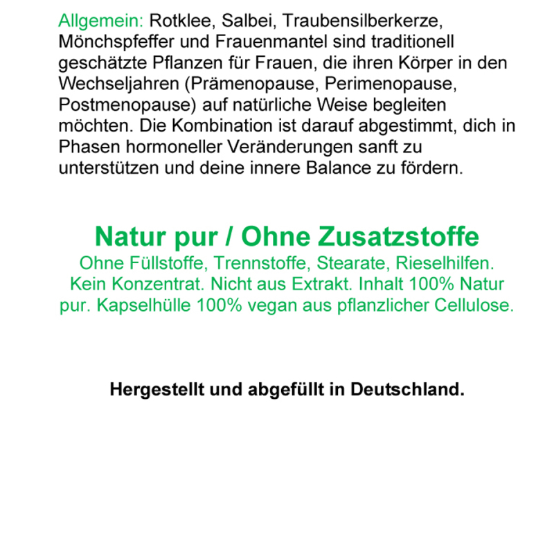 Inhaltsstoffe / Zutaten: KAPSELINHALT: 100% NATUR pur. Rotklee, Salbei, Traubensilberkerze, Mönchspfeffer, Frauenmantel. Naturdosiert (nicht künstlich hochdosiert). VEGANE KAPSELN 100% pflanzlicher Cellulose (Hydroxypropylmethylcellulose).